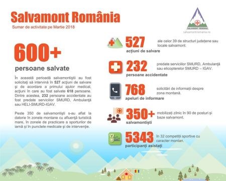 Asociaţia Naţională a Salvatorilor Montani din România (A.N.S.M.R.) şi Consiliul Serviciilor Publice Salvamont au centralizat activitatea, pe luna martie a anului 2018, a celor 39 de structuri judeţene sau locale salvamont din cele 24 de judeţe cu activitate de salvare montană din România. Deşi luna martie este caracterizată printr-un număr din ce în ce mai scăzut de turişti pe munte, dar şi o perioadă în care se organizează foarte multe competiţii sportive cu caracter montan, s-a impus asigurarea asistenţa de salvare montană la un nivel maxim, zilnic, un număr de 250 – 300 de salvamontişti la datorie în zonele montane cu afluenţă turistică mare, în zonele de practicare a sporturilor de iarnă, în punctele medicale şi de intervenţie din cca 90 de posturi şi baze salvamont.