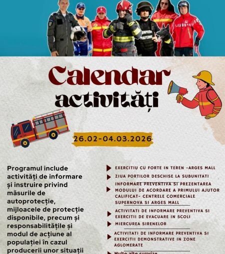 De asemenea, în data de 28 februarie 2026, între orele 13:00 – 16:00, în municipiul Curtea de Argeș vor avea loc activități de informare preventivă și exerciții demonstrative, desfășurate în zone aglomerate, cu scopul de a crește gradul de conștientizare al populației.