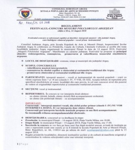 Consiliul Județean Argeș, prin Școala Populară de Arte și Meserii Pitești, Inspectoratul Școlar Județean Argeș în colaborare cu Primăriile, Casele de Cultură, Căminele Culturale și școlile din toate localitățile județului Argeș organizează în municipiul Pitești în data de 14 august 2018, Festivalul „Mugurii Folclorului Argeșean”. Manifestare cu caracter județean, Festivalul își propune ca principal obiectiv: redescoperirea, cunoașterea, promovarea și valorificarea tezaurului etnofolcloric argeșean.