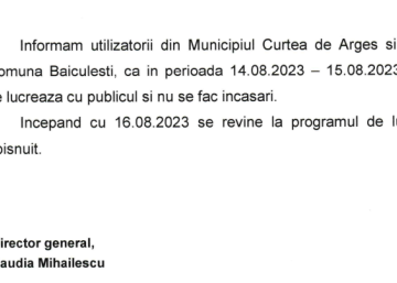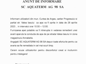 ”Informăm utilizatorii din mun. Curtea de Argeș, în special pe cei din zonele: strada Râmnicu Vâlcea (de la stada Zlotești în aval), Noapteș, Șipot, precum Citește mai mult