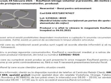 Kaufland retrage voluntar și preventiv, din motive ce țin de protejarea consumatorilor, produsul: Newcential – Benzi pentru antrenament, Cod EAN 4337185747427,Lot: 1234261-4020 (Numărul lotului este Citește mai mult