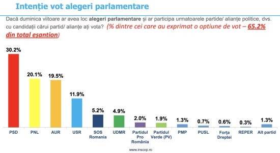 Ultimul sondaj INSCOP, cu privire la intenția de vot la alegerile parlamentare, arată că la intenție de vot, PSD ar lua 30,2%, urmat de PNL, cu 20,1%, AUR cu 19,5%. Acestea ar fi cele trei partide de pe podium, după ce AUR ar fi surclasat USR, care a picat la 11,9% conform sondajului INSCOP. Ar face pragul și partidul Dianei Șoșoacă, cu 5,2%. UDMR este dat la 4,9%.