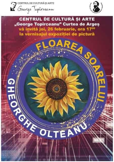 Centrul de Cultură și Arte „George Topîrceanu” vă invită joi, 26 februarie 2026 de la ora 17.00, la vernisajul expoziției de pictură „FLOAREA SOARELUI”, semnată de cunoscutul pictor argeșean Gheorghe Olteanu.