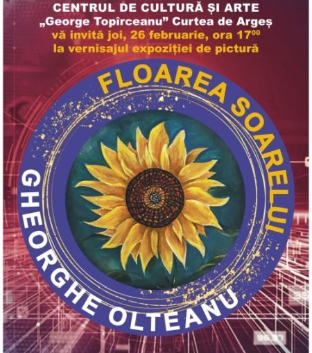 Centrul de Cultură și Arte „George Topîrceanu” vă invită joi, 26 februarie 2026 de la ora 17.00, la vernisajul expoziției de pictură „FLOAREA SOARELUI”, semnată de cunoscutul pictor argeșean Gheorghe Olteanu.