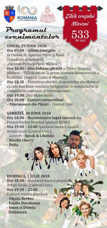 În perioada 30 iunie – 1 iulie, locuitorii orașului Mioveni sunt invitați să participe la spectacolele organizate cu ocazia Zilelelor Orașului. Primarul Ion Georgescu a anunțat programul complet, ce va avea deschiderea oficială vineri, 29 iunie, la orele 16.00.