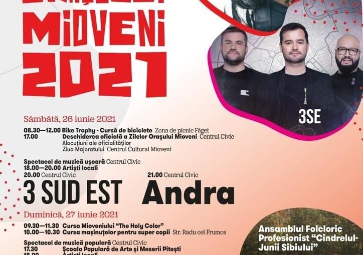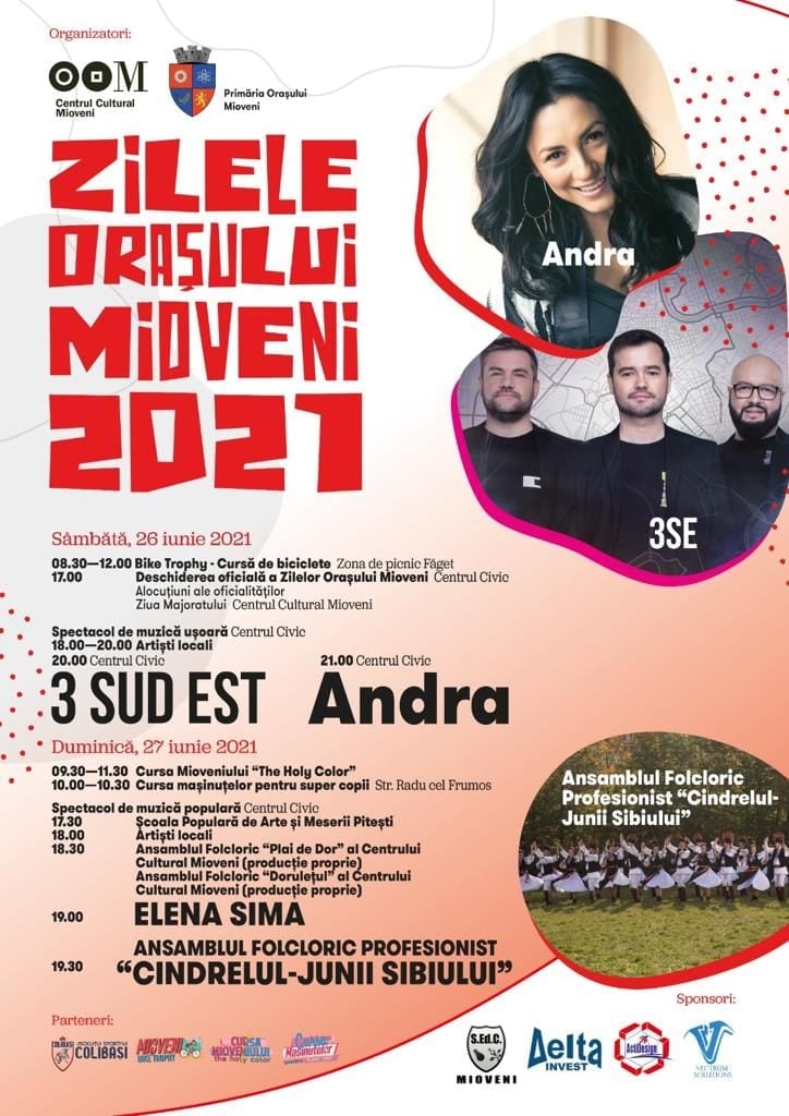 Super concert ANDRA și 3 SUD EST, Ansamblul Folcloric Profesionist „Cindrelul-Junii Sibiului”, Elena Sima, Ansamblul „Plai de Dor”, Mioveni Bike Trophy, Cursa Mioveniului „The Holly Color”, Cursa Mașinuțelor, Rock’N’Ride Fest și multe alte surprize vă așteaptă la sărbătoarea Zilelor Orașului Mioveni, ediția 2021!