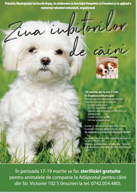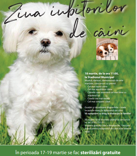 Copii, părinți, bunici, iubitori de animale, pe toți vă așteptăm pe 18 martie, începând cu ora 11:00, la Stadionul Municipal, la ” Ziua iubitorilor de câini” !