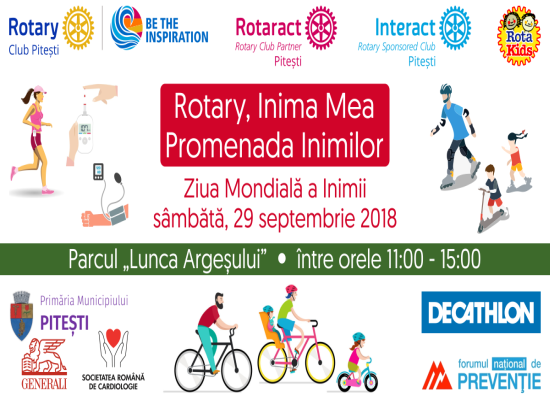 Cluburile din familia Rotary Pitești (Rotary, Rotaract, Interact și RotaKids) desfășoară evenimentul „Rotary Inima Mea – Promenada Inimilor”, dedicat Zilei Mondiale a Inimii, în parteneriat cu Primăria Municipiului Pitești, Decathlon, Generali, Societatea Română de Cardiologie și Forumul Național de Prevenție, în Parcul Lunca Argeșului, sâmbătă, 29 septembrie 2018, între orele 11:00 – 15:00.