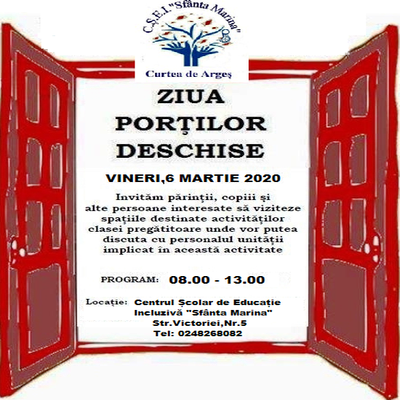 Vineri, 6 martie 2020, intre orele 08.00 – 13.00, în cadrul activității ”Ziua Porților Deschise”, invităm părinţii, copiii şi alte persoane interesate să viziteze spaţiile destinate activităţilor clasei pregătitoare unde vor putea discuta cu personalul Centrului Școlar de Educație Incluzivă,,Sfânta Marina,, din Municipiul Curtea de Argeș.